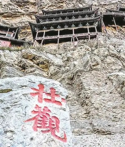 大部分去过悬空寺的人,都会留意到寺外峭壁上的“壮观”二字。据说这是诗人李白当年游览悬空寺时留下的墨宝。但细心的人们发现,这个“壮观”的“壮”字多了一点,这是怎么一回事呢?